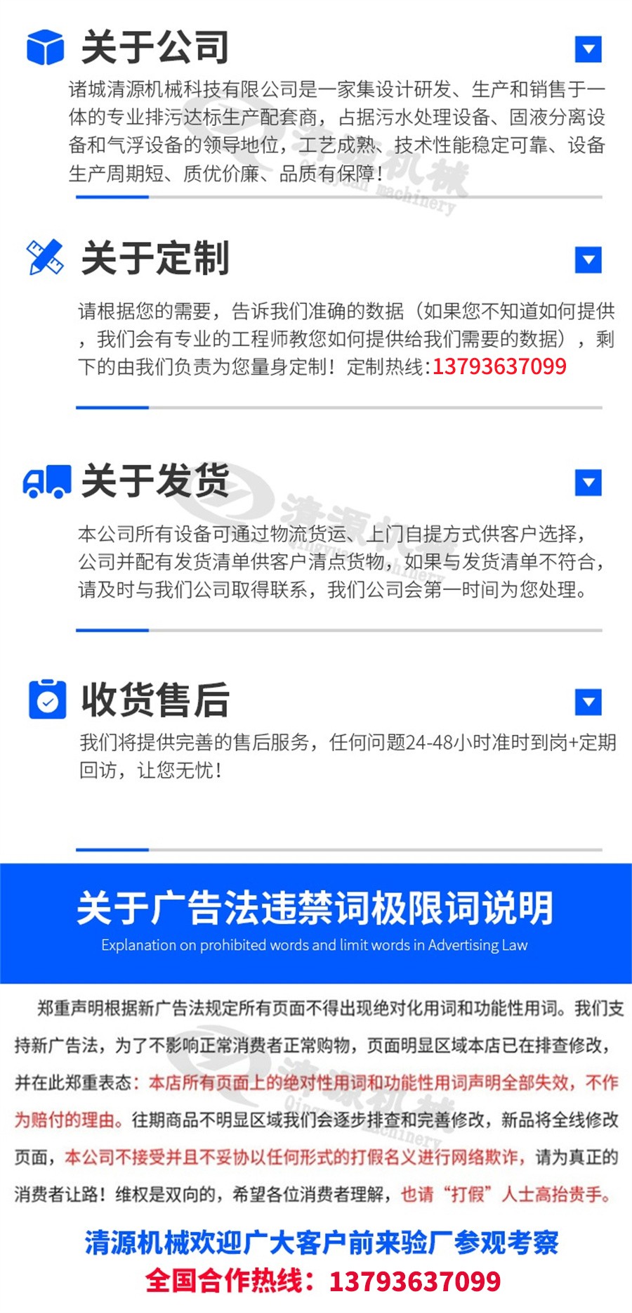 8、過濾器、泵類、配電裝置、空氣壓縮機、減速機等的安全使用要求都以各自的使用說明書或其它文件的規定為準,不得隨意改變。