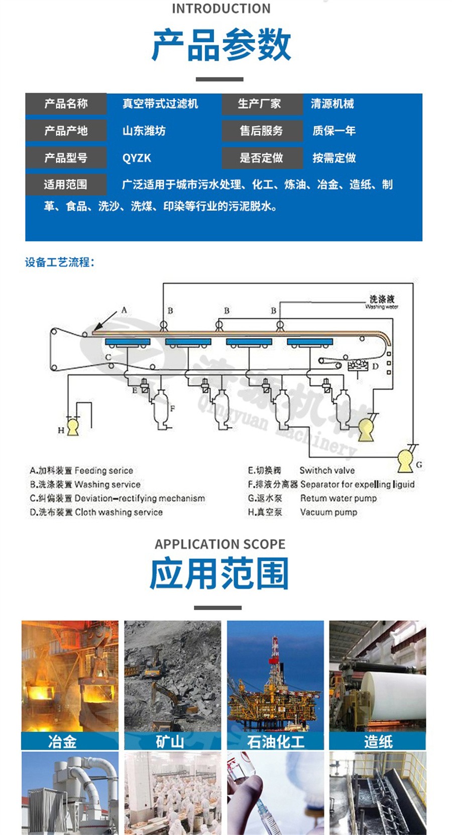 真空帶式過濾機是一種自動化程度高的新型過濾設備,該機以過濾布或濾網為介質,使料漿水平布置于過濾介質之上,充分利用料漿重力和真空吸力實現固液分離。連續水平帶式真空過濾機可適用于多種濃度條件下的物料,過濾效率高,因而被重多工業界優先采用。
