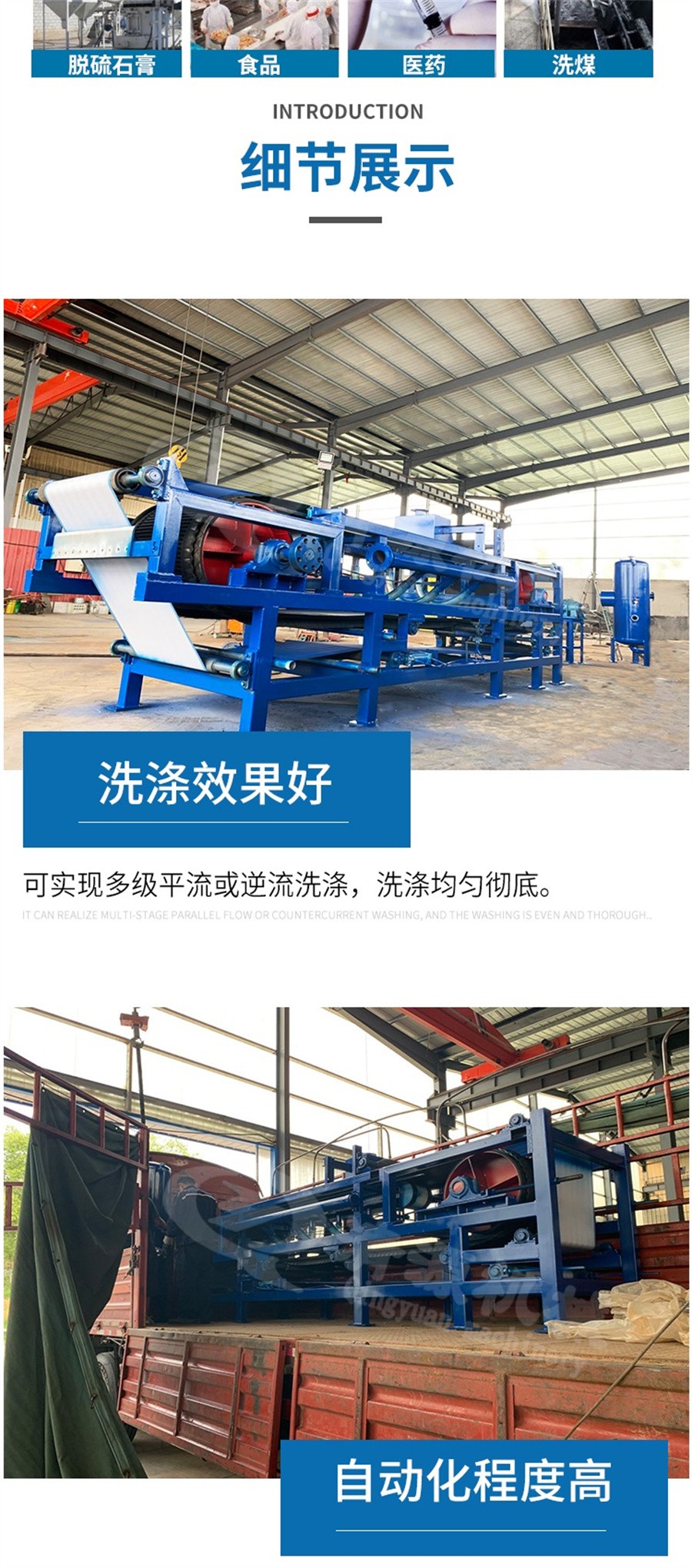 3: 濾工藝方便; 濾餅厚度. 洗水量. 逆流洗滌級數. 真 空度. 濾布速度任意調整,以達到更佳過濾效果。 4 : 洗滌效果好; 可實現多級平流或逆流洗滌,洗滌均勻徹底,母液和洗滌液根據 工藝需要可分開收集和再利用。