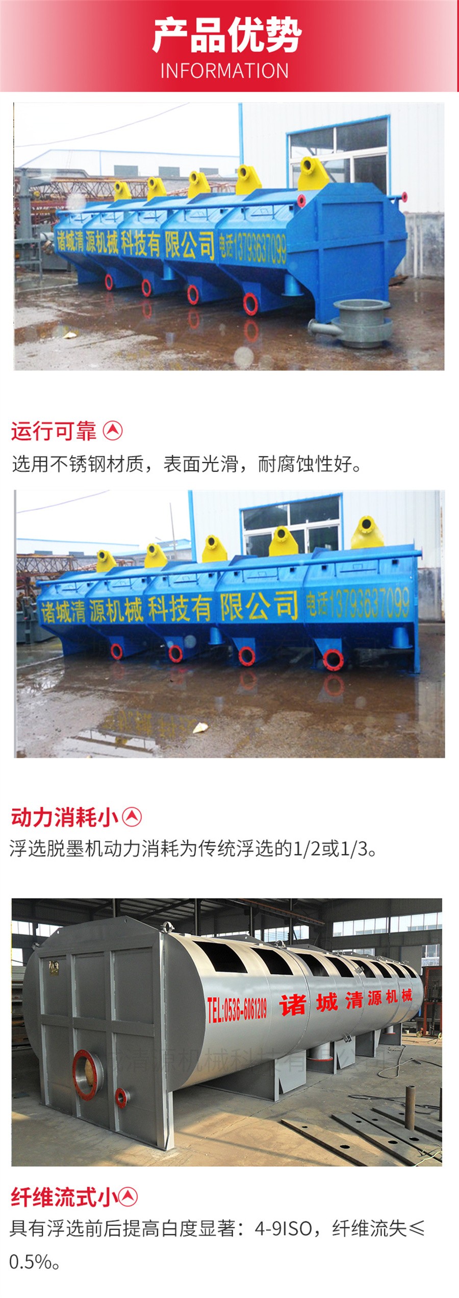 1、浮選效率高,浮渣濃度高,纖維流失小。油墨排出濃度是可以調節的,因此可以大大減少浮渣中纖維的流失。